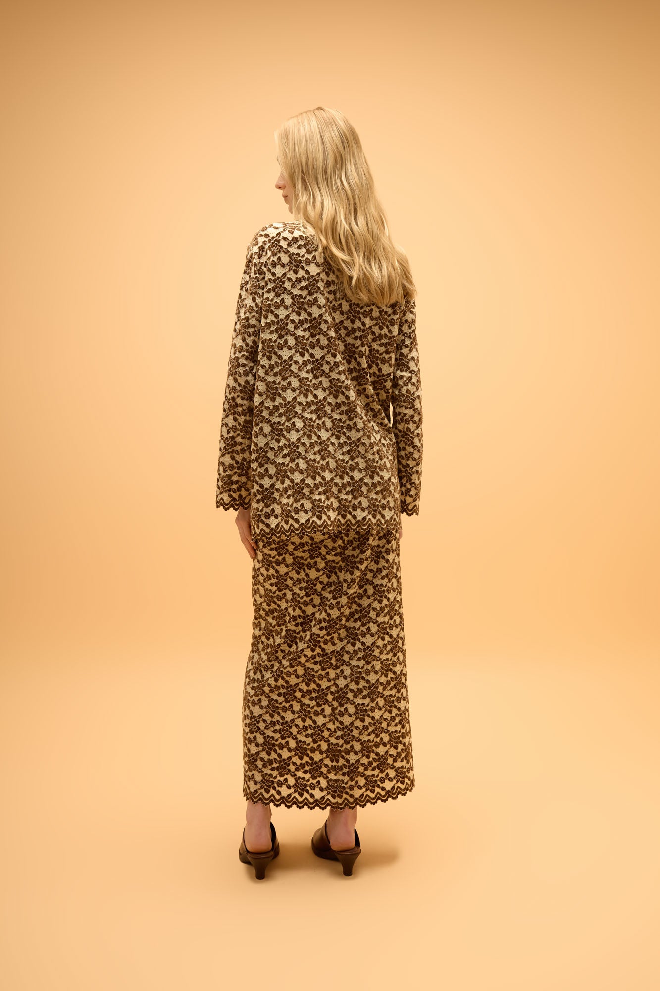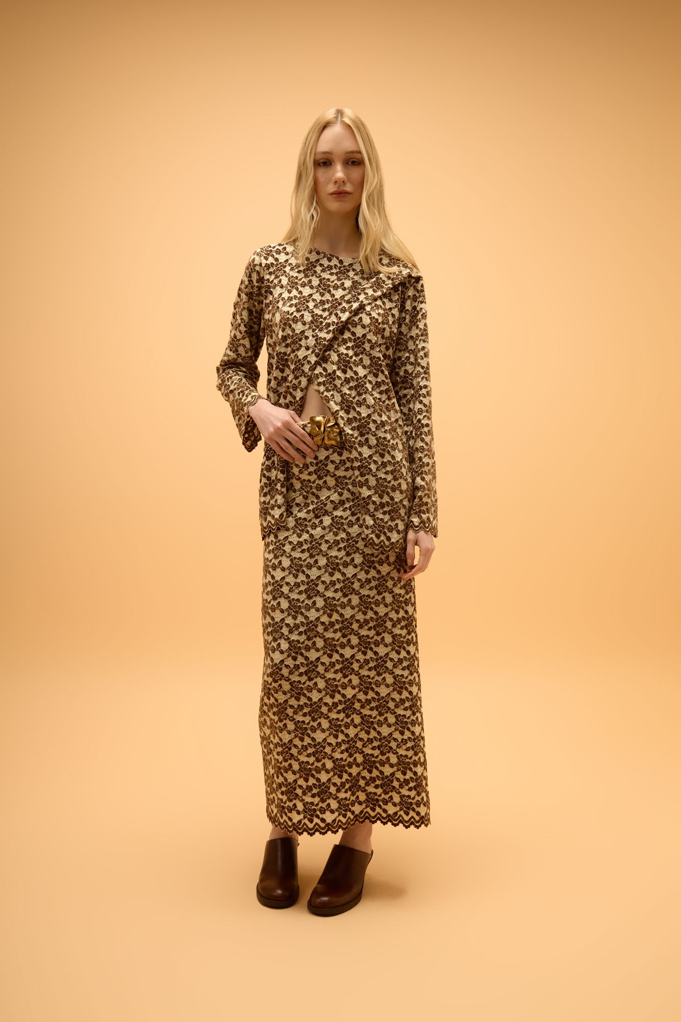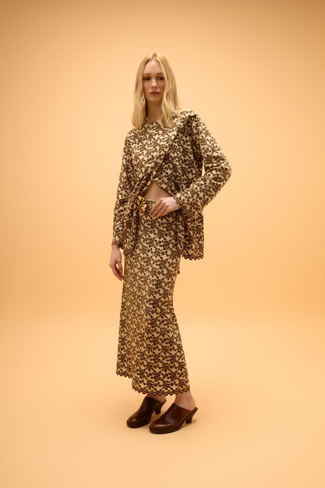 Blusa de manga longa em devorê com padronagem floral. Possui modelagem reta com caimento solto ao corpo, mangas alongadas e detalhe de transpasse frontal que cria um efeito cruzado na parte da frente.
