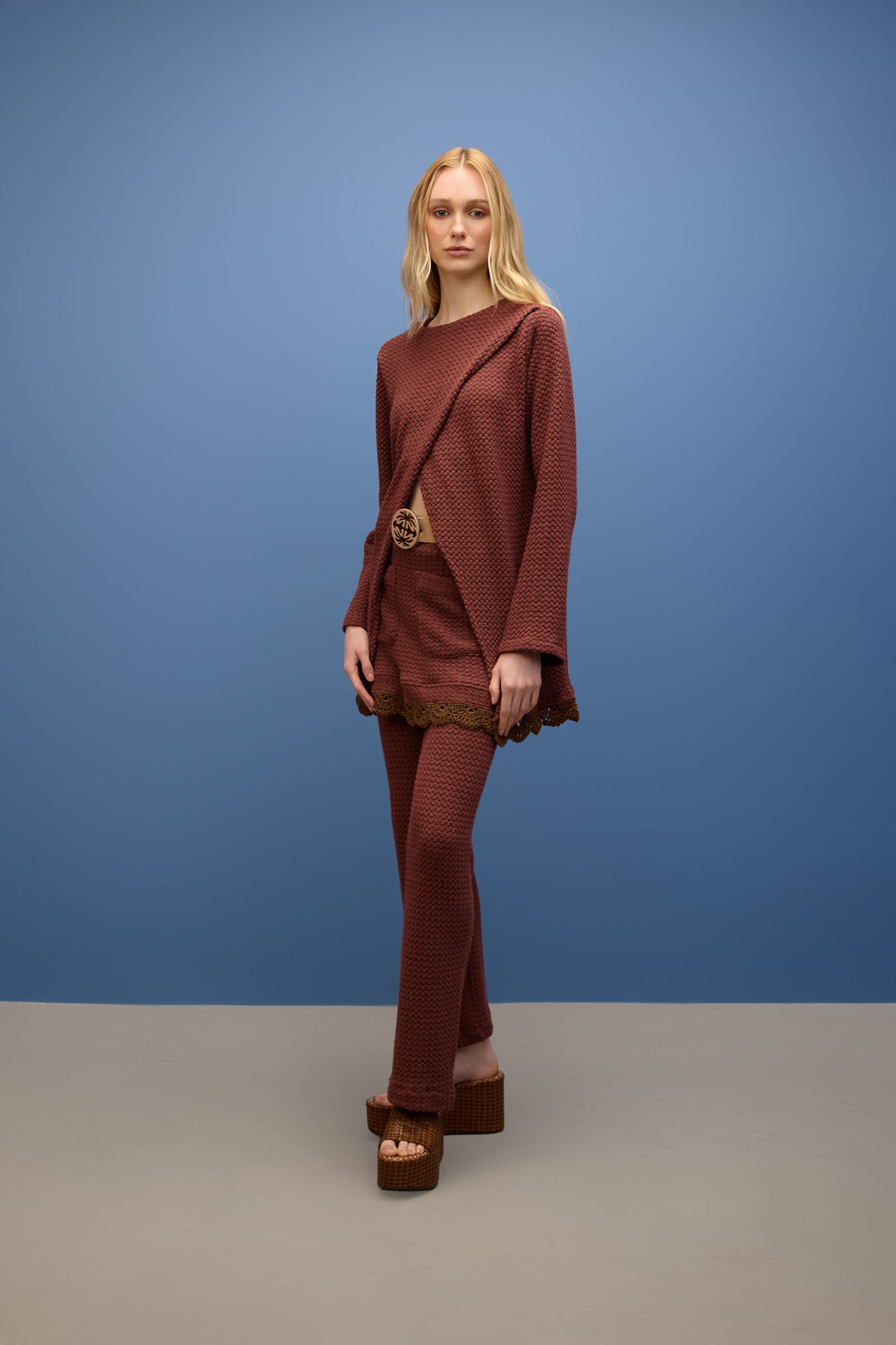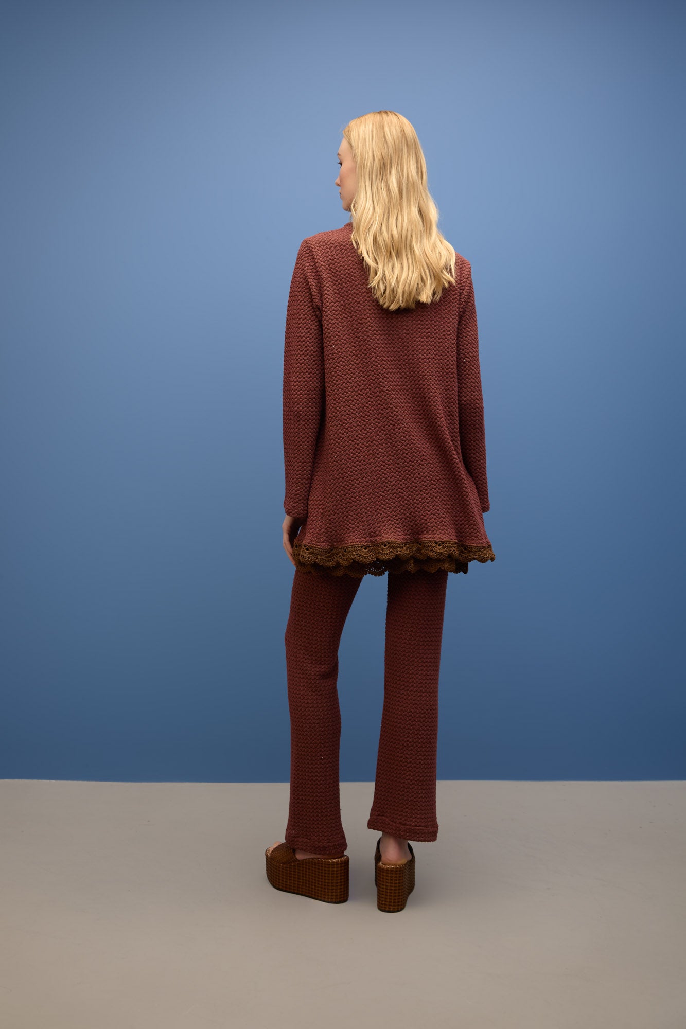 Blusa em malha texturizada, com modelagem reta e caimento confortável. Possui barra com acabamento em crochê, trazendo um toque artesanal e delicado à peça.