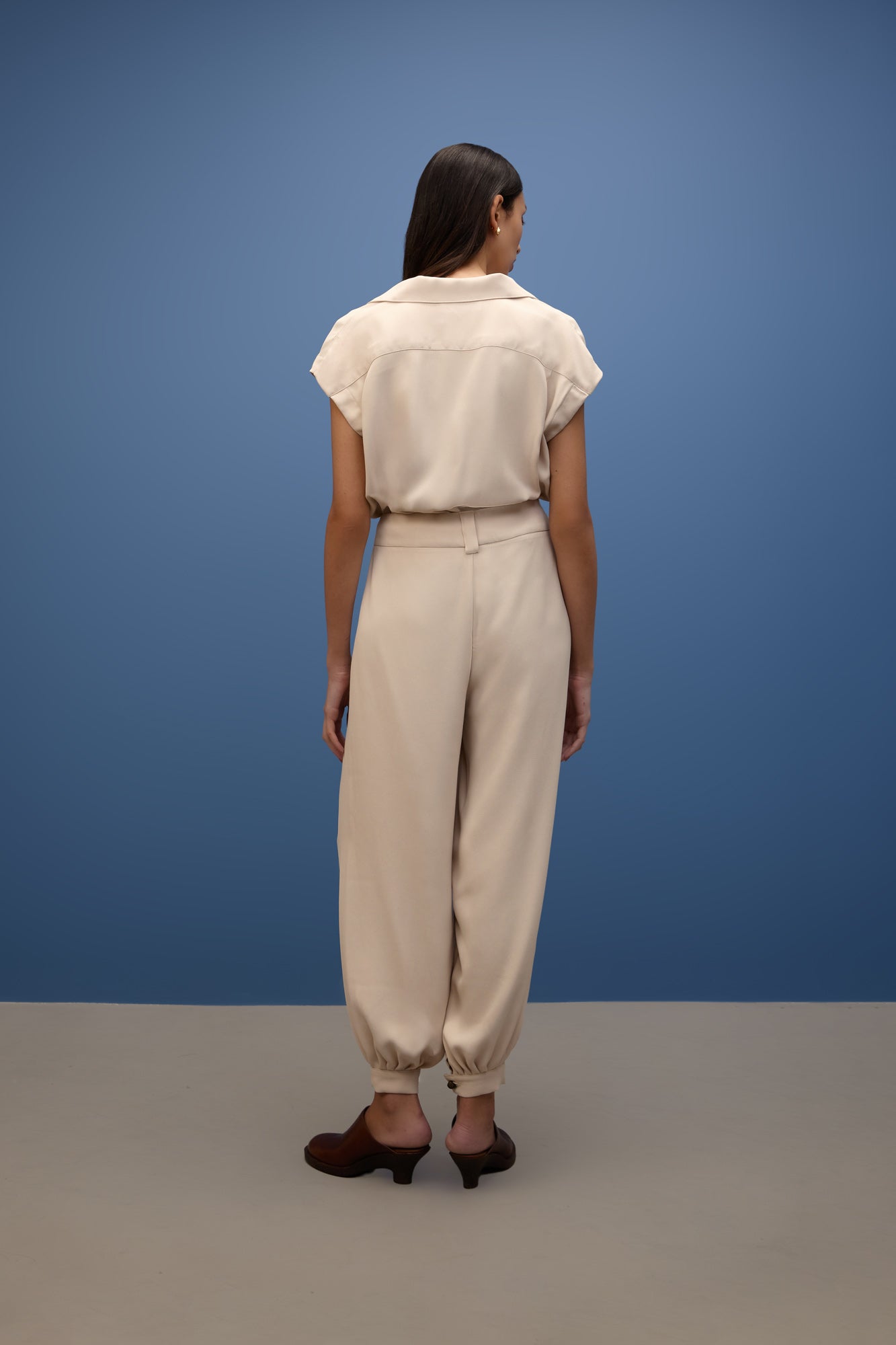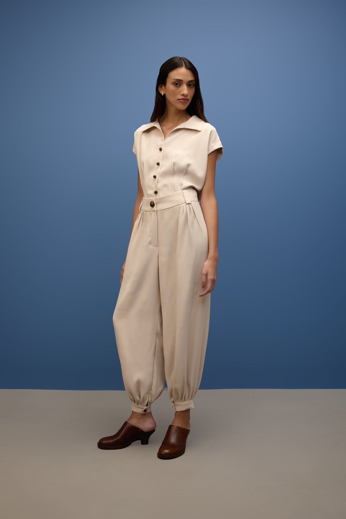 Possui modelagem de cintura alta, valorizando a silhueta, com cós estruturado e passantes discretos. O fechamento frontal conta com zíper e botão elaborado.