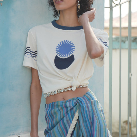Saia Pareô Listrada com Franja. Shape assimétrico com amarração lateral. As listras coloridas criam uma composição vibrante e atemporal, enquanto a franja na barra adiciona textura e um toque artesanal. Fechamento com zíper invisível na lateral, que garante praticidade sem comprometer o caimento fluido.