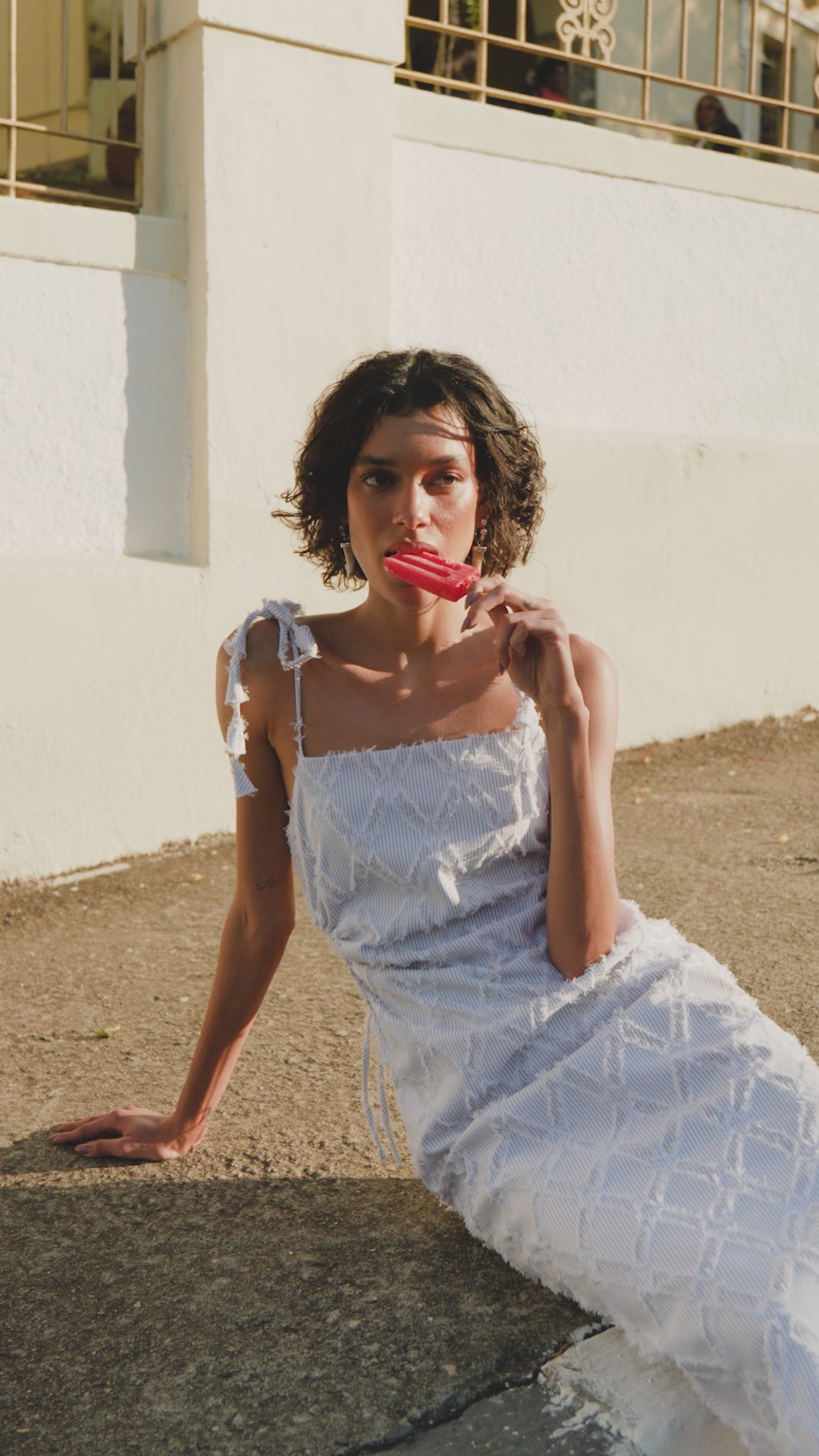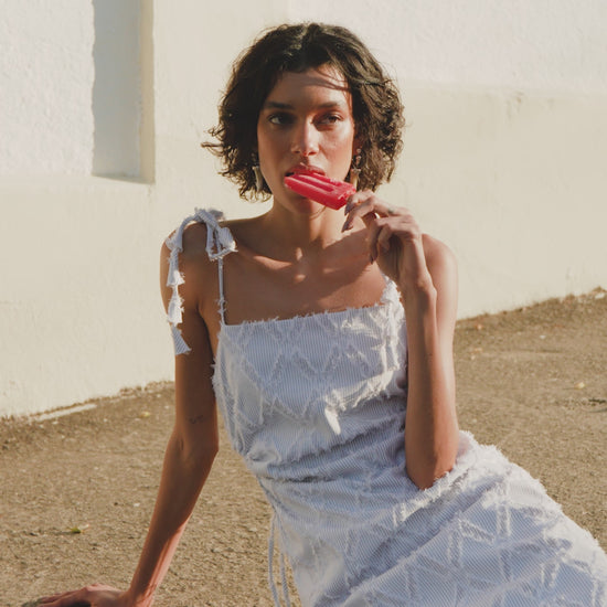 Confeccionado em tecido texturizado e desfiado Modelagem reta, decote quadrado e alças finas com amarração ajustável. Possui detalhe lateral franzido com regulagem por tiras, proporcionando ajuste ao corpo e fenda sutil. Zíper invisível nas costas.